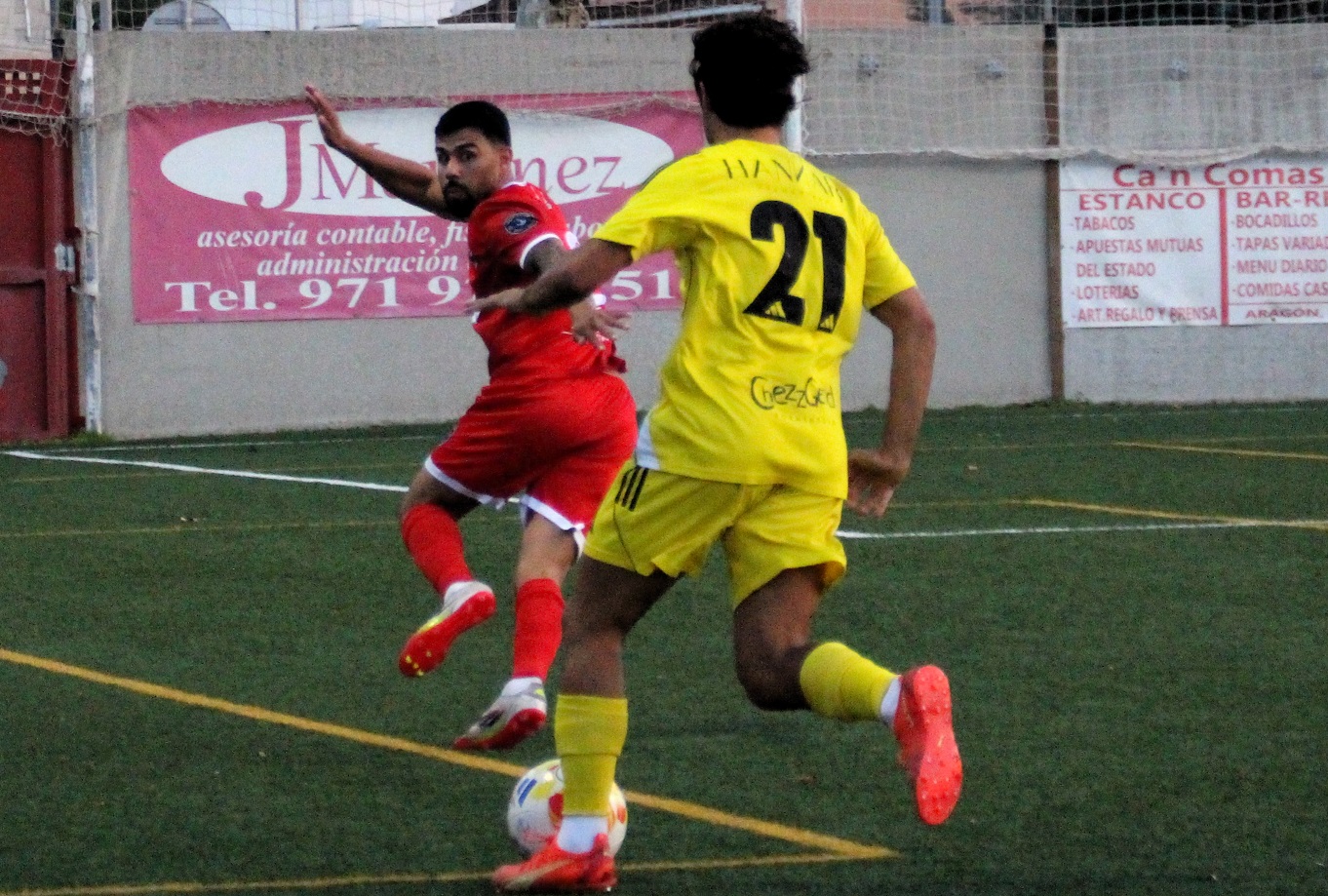 PENALTY FAVORABLE AL CD. SON CLADERA. En el minuto 63 David Sanz traba a Pere Mascaró, y el colegiado sin dudarlo marca el punto roja del máximo castigo