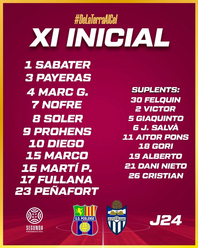 UD Poblense: Sabater; J. Payeras, Marc García, Onofre; D. Martínez (Aitor Pons, 51′), Fullana, M. Payeras, M. Soler (Gori, 69′), M. Alarcón (Alberto, 69′); Prohens (Nieto, 83′) y Penyafort (Salvà, 83′).
